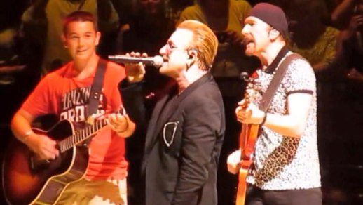 The television station reports, "BRIAN was sitting in the front row at the U2 concert with his family SATURDAY night. He was holding a sign which read, 'I play guitar,' that’s when Bono chose him."