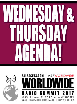 If you've never attended, and you've wanted to -- stop and make your plans now for the seventh annual WORLDWIDE RADIO SUMMIT -- presented by A&R WORLDWIDE and ALLACCESS.COM! WWRS 2017 is returning to the W HOTEL HOLLYWOOD, (where WWRS began in 2010), and is set for MAY 3rd, 4th, 5th, 2017. Registration is $475 and many of your peers are all set to attend.