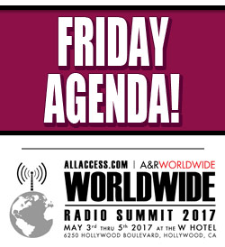If you've never attended, and you've wanted to -- stop and make your plans now for the seventh annual WORLDWIDE RADIO SUMMIT -- presented by A&R WORLDWIDE and ALLACCESS.COM! WWRS 2017 is returning to the W HOTEL HOLLYWOOD, (where WWRS began in 2010), and is set for MAY 3rd, 4th, 5th, 2017. Registration is $475 and many of your peers are all set to attend.