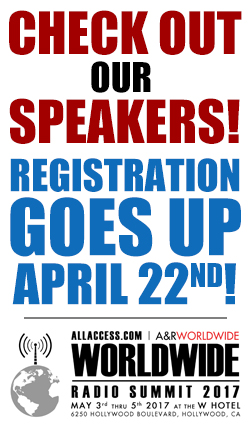 If you've never attended, and you've wanted to -- stop and make your plans now for the seventh annual WORLDWIDE RADIO SUMMIT -- presented by A&R WORLDWIDE and ALLACCESS.COM! WWRS 2017 is returning to the W HOTEL HOLLYWOOD, (where WWRS began in 2010), and is set for MAY 3rd, 4th, 5th, 2017. Registration is $475 and many of your peers are all set to attend.