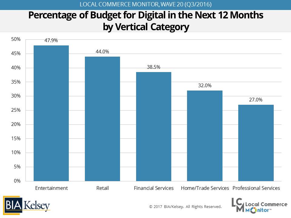 As you can see in the chart below, small businesses in the Entertainment field are planning to put more of their ad budget into digital media than small businesses in other categories. Retail small businesses were close behind, with 44%. Professional services small businesses, on the other hand, are planning to put a significantly smaller portion of their ad budgets towards digital advertising.