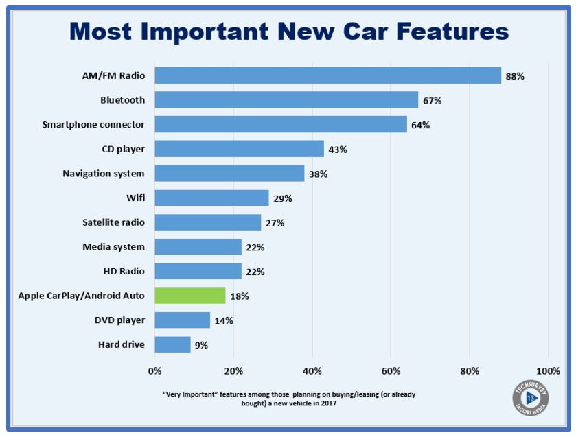 JACOBS notes, "Realizing the importance of these dashboard ecosystems on radio, we’ve been tracking consumer interest in both platforms in our Techsurveys these past two years. Among those who purchased a new car or are in the market for one in 2017, APPLE CARPLAY and ANDROID AUTO are well down the list of the most important media, tech, and entertainment features: