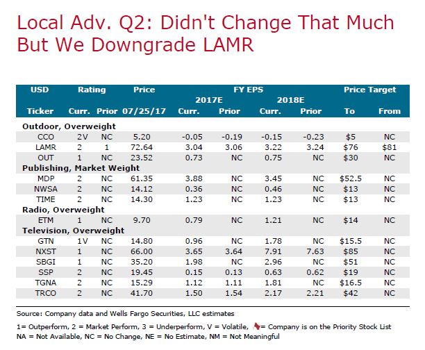 RYVICKER notes, "Radio is also slow but improving. We are looking at -2% Q2E rev. growth (same station) for ETM (+1% with CHARLOTTE) and -3.5% for CBS RADIO. Q3 should be a little easier for these guys given no OLYMPIC comps. As such, we forecast +2% for ETM and -2.5% for CBS RADIO."