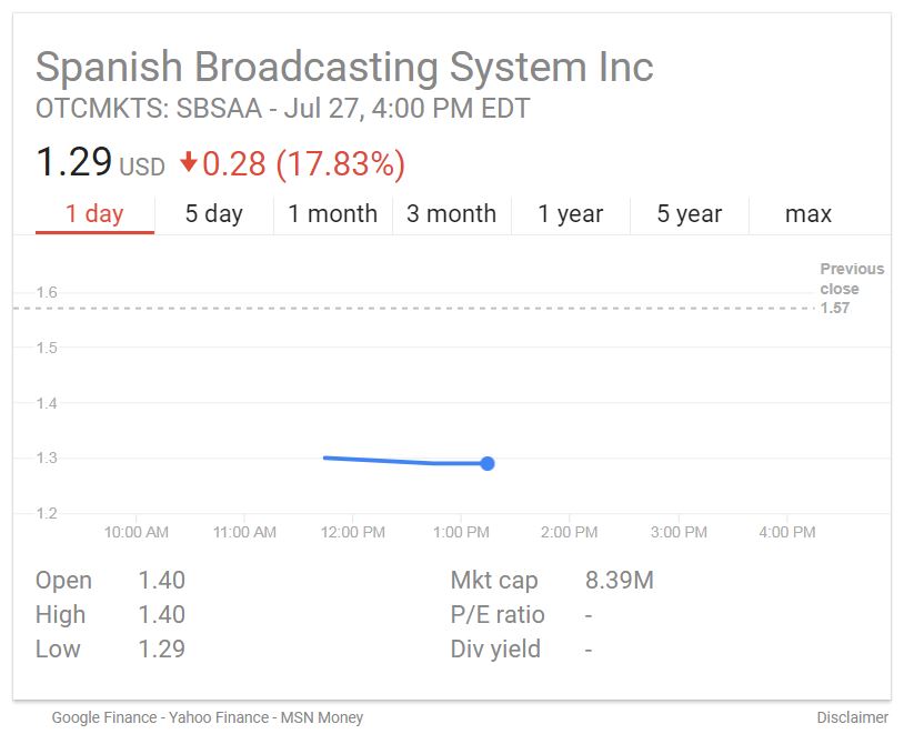 The company wrote, "On APRIL 3, 2017, SPANISH BROADCASTING SYSTEM, INC. (the 'Company'), received a written notice from OTC MARKETS ('OTC'), advising us that our market capitalization had stayed below $5 million for more than 30 consecutive calendar days (the 'Rule') and that it no longer met the Standards for Continued Qualification for the OTCQX Best Market (U.S. Tier) ('OTCQX U.S.') as per the OTCQX Rules for U.S. Companies. OTC further notified us that a cure period of 180 calendar days to regain compliance had begun, during which the minimum criteria must be met for 10 consecutive trading days. The 180-calendar day grace period was set to expire on SEPTEMBER 30, 2017. If the Company's market capitalization had not been at or above $5 million for 10 consecutive trading days by that time, then its Class A common stock would be moved from OTCQX U.S. to OTC Pink.
