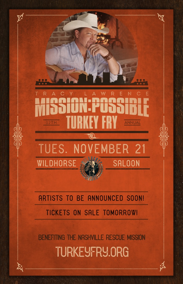 Country artist TRACY LAWRENCE is set to host his 12th annual "MISSION:POSSIBLE TURKEY FRY" on TUESDAY, NOVEMBER 21st at NASHVILLE's WILDHORSE SALOON. Performances include LUKE COMBS and HALFWAY TO HAZARD, with more to be announced at a later date. The event benefits NASHVILLE RESCUE MISSION to provide a warm meal and needed items for those less fortunate during THANKSGIVING. Tickets go on sale this FRIDAY, SEPTEMBER 22nd at 11a (CT) here.