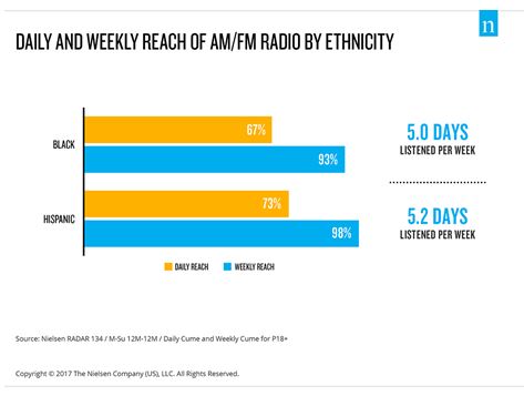 Knowing which formats consumers tune in is a critical part of understanding their listening habits. Of the top 20 formats in 2017, Country and News/Talk were the top two, securing 13.6% and 12.2% shares of audience, respectively (of all radio listening nationwide, 13.6% went to Country stations, and 12.2% went to News/Talk). "Because radio formats are tailored to reach large groups of people with common interests," notes NIELSEN, "it’s an effective media to reach more diverse audiences. For example, at least 67% of black and Hispanic consumers listen to AM/FM radio daily: Hispanics tune in an average 5.2 days per week, and blacks tune in 5 days per week."