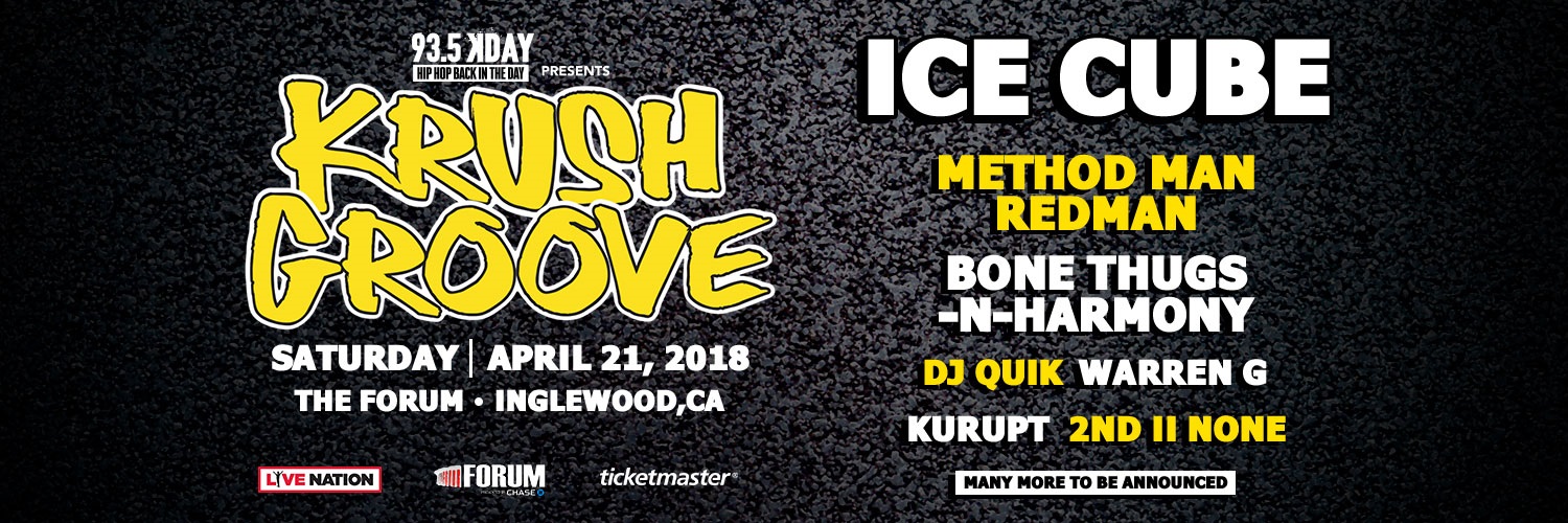MERUELO MEDIA Rhythmic AC KDAY/LOS ANGELES has announced their 2018 KRUSH GROOVE concert. The APRIL 21st show at THE FORUM will be headlined by ICE CUBE Joining ICE CUBE will be METHOD MAN, REDMAN, BONE THUGS-N-HARMONEY, DJ QUIK, WARREN G, KURUPT, 2ND II NONE and more to be announced.