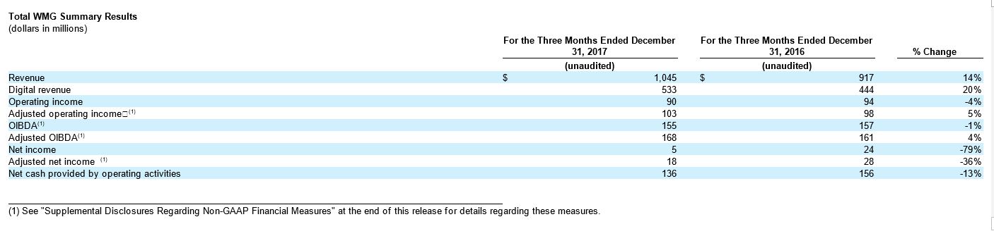 WARNER MUSIC GROUP CORP. has reported first-quarter financial results for the period ended SUNDAY, DECEMBER 31st, 2017.