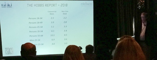 GABE HOBBS opened the day with his fourth annual "talk radio report card" deep-dive into the format's Adults 25-54 ratings among 44 of the 48 PPM markets (44 of the top 52 markets overall), showing that the overall numbers remain relatively flat -- the share was up from 2.5 in 2016 to 2.6 in 2017, up from 2014-15's bottom of 2.4. AQH persons also remained flat at 3,000 year-to-year, maintaining the election increase but still down 21% from 2011. Cume fell 1.8% from 2016, but still above 2015's level (yet well below 2011's level), and time spent listening, HOBBS noted, is "up a bit."