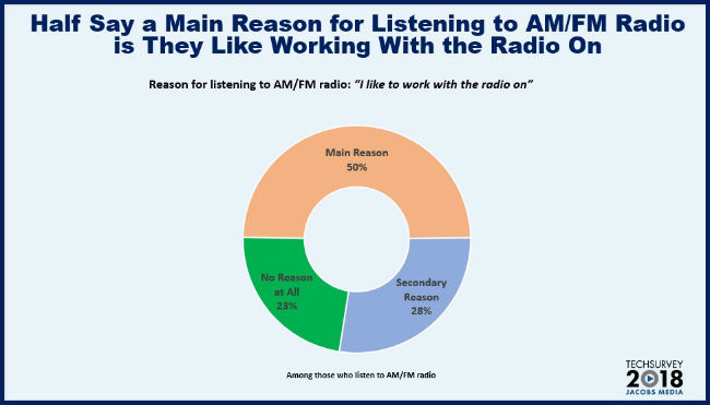 Broadcast radio has many assets and attributes, but workplace companionship continues to be a plus for half of all respondents.