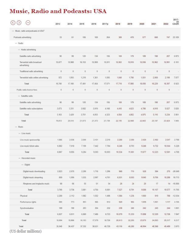 The U.S. music, radio and podcasts market was worth $40.7 billion in 2017, and is forecast to increase at a 4.0% CAGR to reach $49.5 billion in 2022.