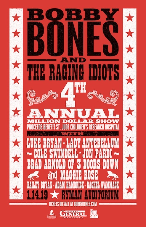iHEARTMEDIA nationally syndicated "THE BOBBY BONES SHOW" host BOBBY BONES has announced "BOBBY BONES & THE RAGING IDIOTS' FOURTH ANNUAL MILLION DOLLAR SHOW," set for MONDAY, JANUARY 14th at NASHVILLE's RYMAN AUDITORIUM. The evening will feature performances by LUKE BRYAN, LADY ANTEBELLUM, COLE SWINDELL, JON PARDI, BRAD ARNOLD of 3 DOORS DOWN, MAGGIE ROSE, BAILEY BRYAN, ADAM HAMBRICK, and RACHEL WAMMACK, along with surprise guests.