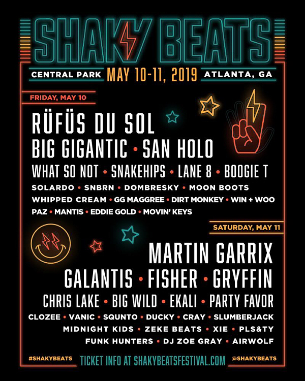 The fourth annual SHAKY BEATS MUSIC FESTIVAL will feature 40 artists on four stages over two days at CENTRAL PARK in downtown ATLANTA, MAY 10th-11th. Headline FRIDAY will be RÜFÜS DU SOL, BIG GIGANTIC and SAN HOLO, while MARTIN GARRIX, GALANTIS, FISHER and GRYFFIN are set to play on SATURDAY.