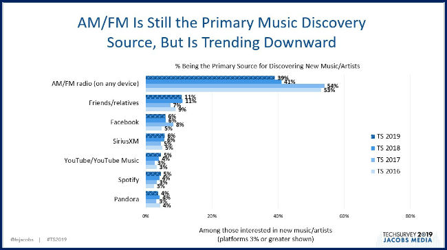 JACOBS MEDIA Pres. FRED JACOBS, who will present this year’s TECHSURVEY at WWRS 2019, commented, “Radio continues to be king among our radio-centric sample, but the trend is definitely heading downward. Oddly enough, other digital platforms aren’t showing growth spikes.”
