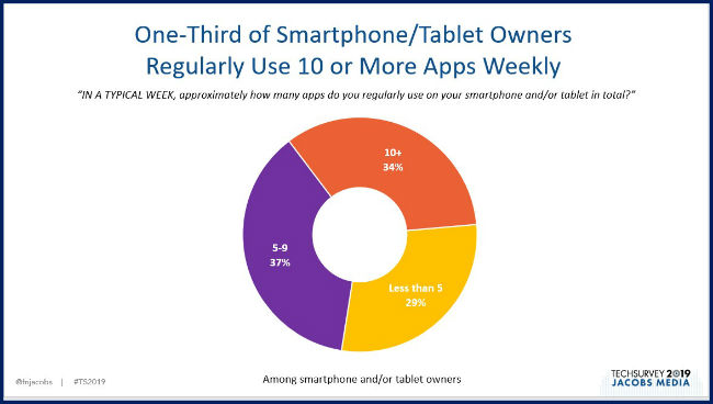 JACOBS MEDIA Pres. FRED JACOBS, who will present this year’s TECHSURVEY at WWRS 2019, commented, “Many mobile device owners tell us they’re very ‘into’ apps. In fact, more than one-third say they use 10 or more apps on a regular basis each week.”