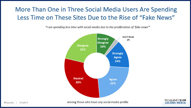 JACOBS MEDIA Pres. FRED JACOBS, who will present this year’s TECHSURVEY at WWRS 2019, commented, “While many say they haven’t altered their social media habits as a result of ‘fake news,’ more than one-third say it has caused them to spend less time on these sites. If this translates from perceptions to actual usage, it signals a change in the way Americans embrace social media.”