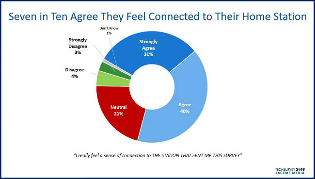 JACOBS MEDIA Pres. FRED JACOBS, who will present this year’s TECHSURVEY at WWRS 2019, commented, “While our survey is primarily comprised of respondents who are station database members or those who follow station or personalities on social media, it is heartening to see how many say they have a strong connection – especially given all the options.”