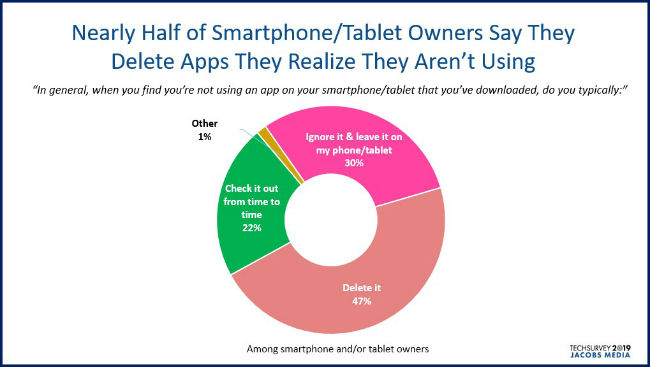 A near majority of those who own mobile devices delete apps they realize they aren’t using.