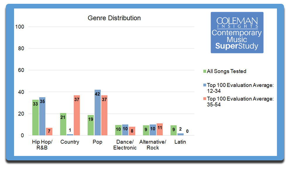 There is far less polarization in Dance/Electronic and Alternative/Rock, both of which perform relatively consistently across age, gender, geography and streaming versus radio usage. Once again, COLEMAN INSIGHTS observes that Pop titles overperform with virtually every segment of the population. “Whether you’re 12 or 54, male or female, live in the city or the country, listen to radio or streaming, Pop music is the center lane of contemporary music for everyone, everywhere,” KURTZMAN said.