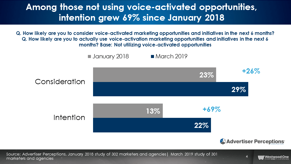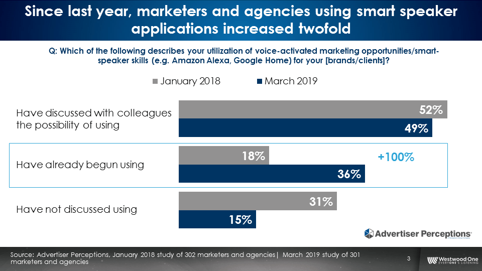 Among the findings, AM/FM radio (18% in second quarter) and AMAZON MUSIC (17%) lead in share of smart speaker time spent listening; ownership of smart speaker devices in AMERICA tripled from second quarter 2017 to second quarter 2019 (10% to 30%); the number of marketers and agencies using smart speaker options doubled from 18% in JANUARY 2018 to 36% in MARCH 2019, according to a WESTWOOD ONE-commissioned ADVERTISER PERCEPTIONS survey; and Millennial (18-34) podcast reach is ip 13% year-to-year to 17.3%, driven by growth among African Americans, Hispanics, and women.