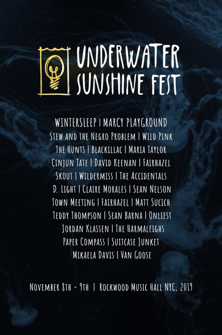 The UNDERWATER SUNSHINE FEST will host its third installment on NOVEMBER 8th and 9th in all three rooms of ROCKWOOD MUSIC HALL on the Lower East Side of MANHATTAN, NY. The first round of performing artists just announced include STEW & THE NEGRO PROBLEM, WILD PINK, MIKAELA DAVIS & SOUTHERN STAR, MARIA TAYLOR and MARCY PLAYGROUND will be returning to the stage while DAVID KEENAN, THE SUITCASE JUNKET, BLACKILLAC, WINTERSLEEP, THE HUNTS, CINJUN TATE (formerly REMY ZERO) and SEAN NELSON (formerly HARVEY DANGER) join the lineup for the first time, along with many others.