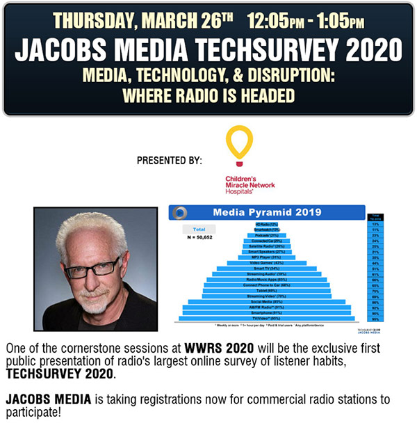 FRED JACOBS TECHSURVEY 2020 – "Media, Technology, & Disruption: Where Radio Is Headed"JACOBS MEDIA President FRED JACOBS mashes up his company’s research with his annual visit to CES to present a lean-forward look at radio’s future in TECHSURVEY 2020. FRED will review some of the key findings from TECHSURVEY 2019, as well as lay out some of the key trends and technologies shaping the radio broadcasting industry. It’s a must-see, must-attend presentation, exclusively at WORLDWIDE RADIO SUMMIT 2020.