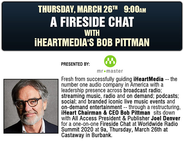 ALL ACCESS has our most powerful line up ever set for WORLDWIDE RADIO SUMMIT 2020 ... and headling the event, we are thrilled and honored to confirm that iHEARTMEDIA Chairman & CEO BOB PITTMAN will sit down with ALL ACCESS President & Publisher JOEL DENVER for a one-on-one Fireside Chat at WORLDWIDE RADIO SUMMIT 2020 at 9A, THURSDAY, MARCH 26th at CASTAWAY in BURBANK, CA. It's sponsored by MR. MASTER.