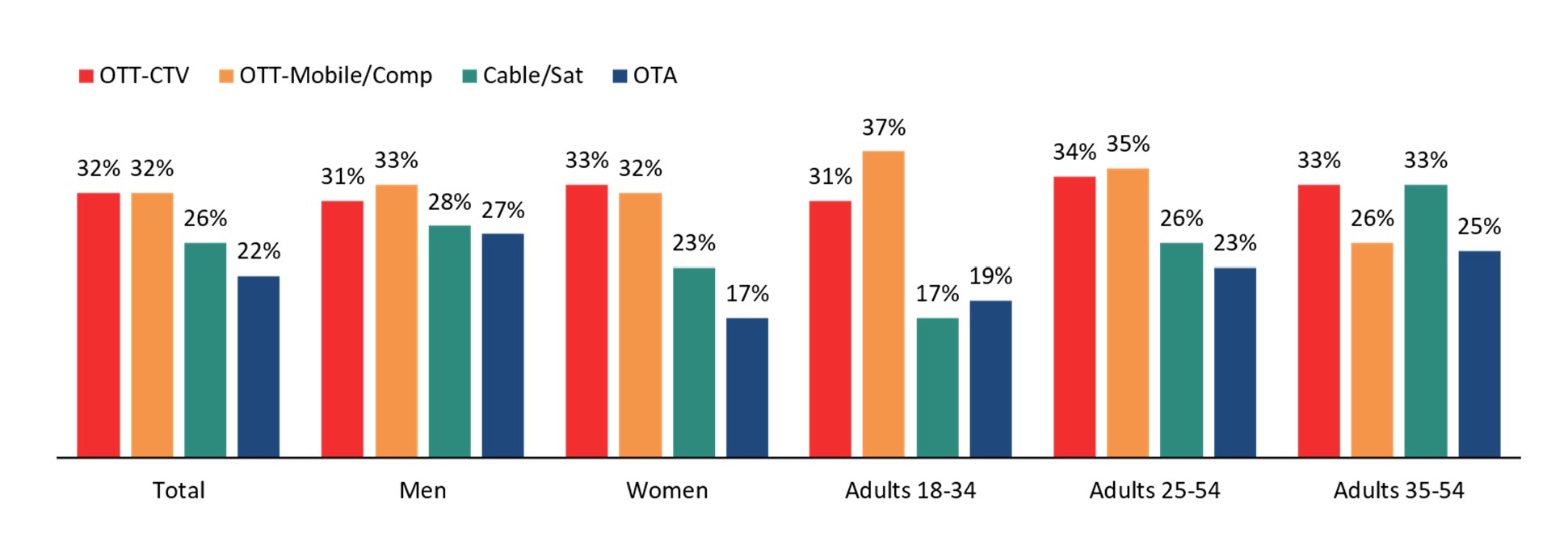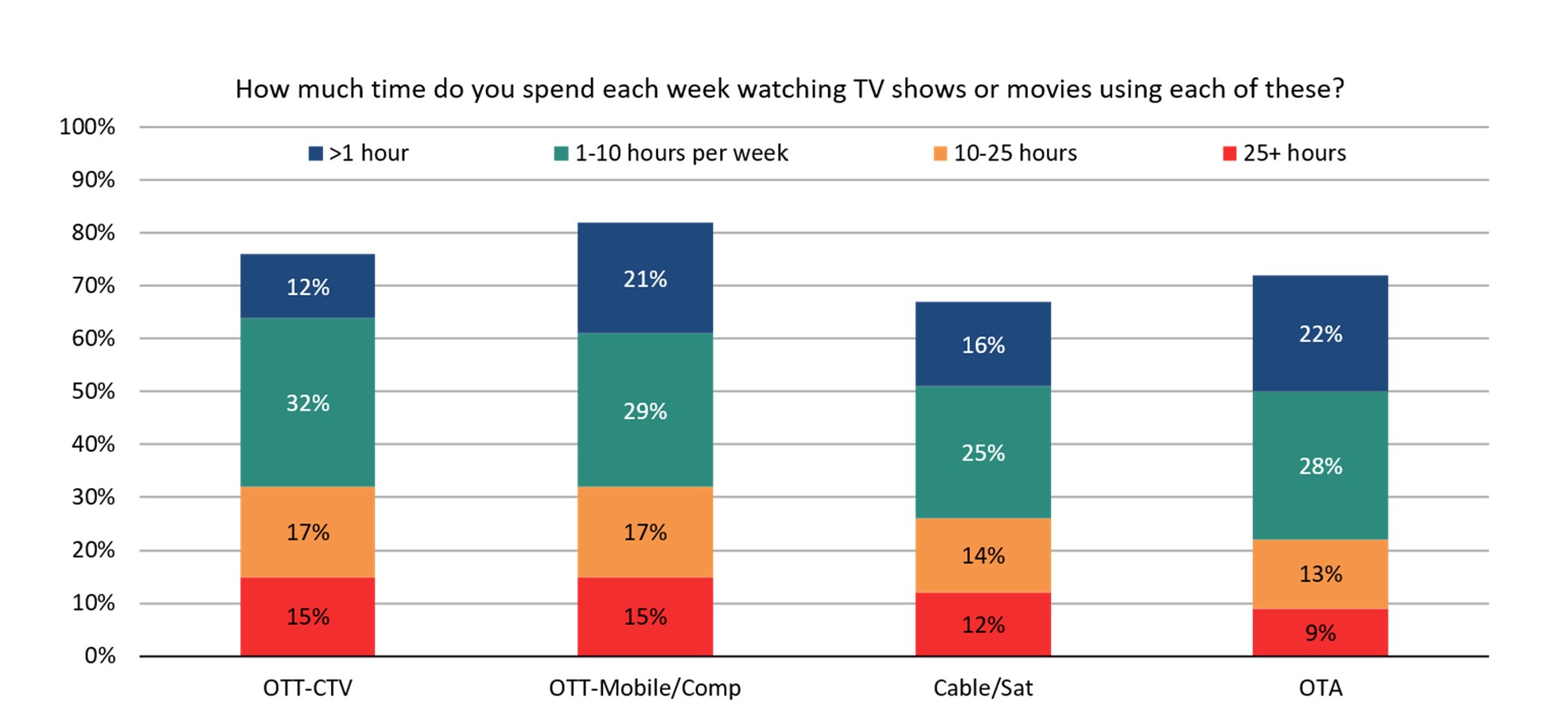 While there are lots of options for advertisers in OTT, NUVOODOO wanted to know if the reach is big enough to justify the marketing expense. Specifically, NUVOODOO split OTT viewing into two buckets: those watching OTT on Smart TV’s and connected devices like ROKU, GOOGLE CHROMECAST, etc. (labeled OTT-CTV) and those watching OTT on smartphones, tablets or computers (labeled OTT-Mobile/Comp). Groups of just under 1/3 a piece are spending 10+ hours per week with OTT in both modes.
