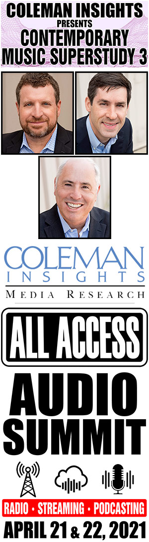 The ALL ACCESS AUDIO SUMMIT will bring you up to speed with what's important now in the fast-changing world of music and metrics, and we are most pleased to welcome COLEMAN INSIGHTS' Contemporary Music Superstudy 3 to our virtual stage.