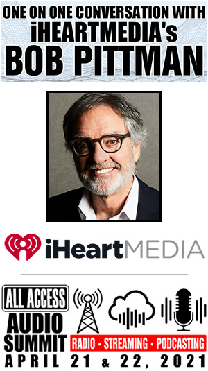 iHEARTMEDIA Chairman/CEO BOB PITTMAN has shaken up the company and the industry with a transformative makeover in direction, resources and now with a new business operating structure splitting the company into three segments. This move alone will generate a lot of interest and questions. PITTMAN is not afraid of a challenge, and he's going to take on your questions, including the hard ones, in a one-on-one conversation with ALL ACCESS Pres./Publisher JOEL DENVER at 8a on APRIL 21st, for 50 minutes. You won't want to miss it.