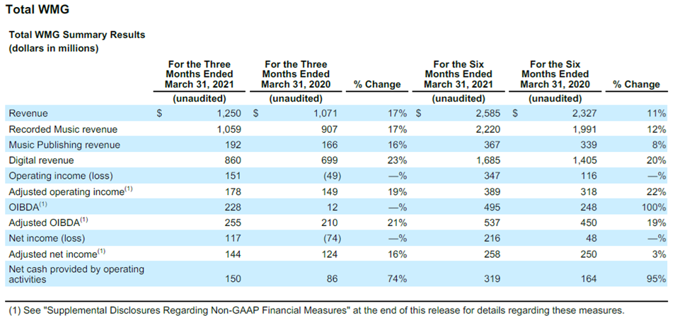 WARNER MUSIC GROUP has released second-quarter financial results for the period ended MARCH 31st, 2021.