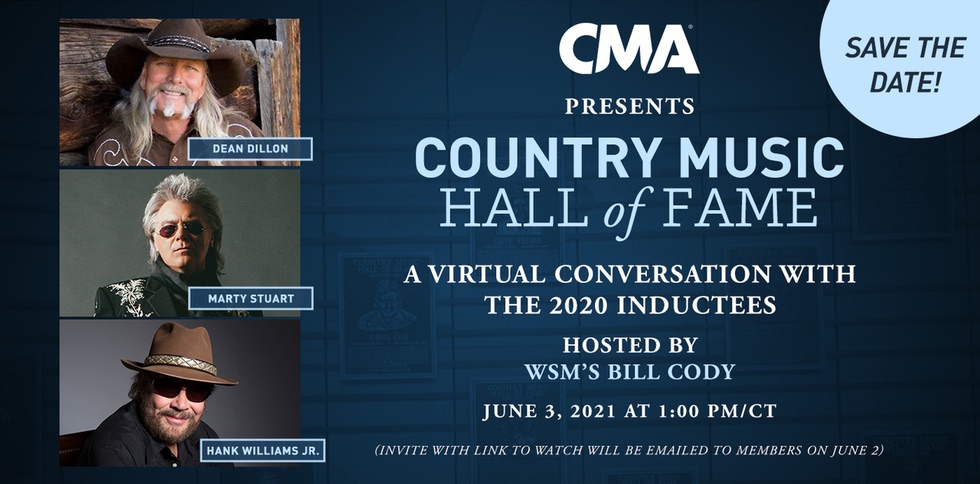 The COUNTRY MUSIC ASSOCIATION (CMA) will host a virtual conversation with its 2020 COUNTRY MUSIC HALL OF FAME inductees — DEAN DILLON, MARTY STUART and HANK WILLIAMS JR. — on THURSDAY, JUNE 3rd at 1p (CT). The event, which is exclusive to CMA members, will be hosted by WSM-A/NASHVILLE morning man BILL CODY, who will conduct a Q&A with the three legends.