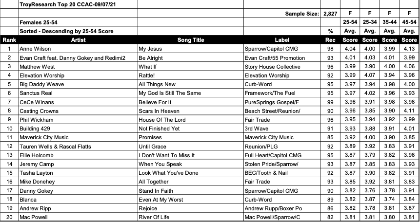 ALL ACCESS Contemporary Christian Format Editor TODD STACH shared, "Many PDs and MDs will look to these test numbers as tool to help make decisions on song adds or movement of their current song categories. Thanks to JONATHAN LITTLE at TROY RESEARCH for his willingness to provide this data at no cost."