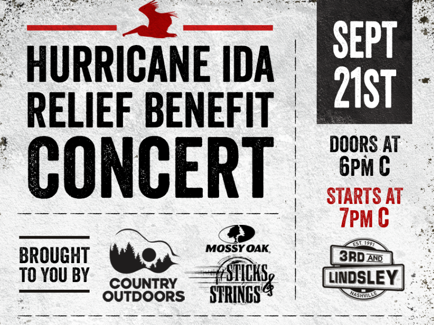 COUNTRY OUTDOORS will hold a "Hurricane Ida Relief Benefit" concert on WEDNESDAY, SEPTEMBER 21st. LAINE HARDY, SEAN STEMALY, KAMERONE MARLOWE and KYLIE FREY will headline at NASHVILLE's 3RD & LINDSLEY to help those effected by Hurricane Ida in LOUISIANA.