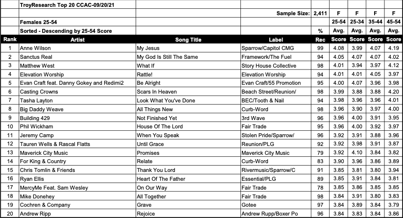 Here's the latest (9/21) W25-54 TROY RESEARCH from its participating Contemporary Christian music stations. Notice the sample size of 2,411.