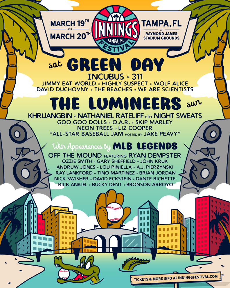 GREEN DAY and THE LUMINEERS to headline the inaugural INNINGS FESTIVAL FLORIDA, at RAYMOND JAMES STADIUM GROUNDS, TAMPA during the GRAPEFRUIT LEAGUE’s spring training, MARCH 19-20th. The two-day event will have three stages featuring performances by INCUBUS, KHRUANGBIN, 311, NATHANIAL RATELIFF & THE NIGHT SWEATS, JIMMY EAT WORLD, GOO GOO DOLLS, O.A.R., HIGHLY SUSPECT. With appearances by MAJOR LEAGUE BASEBALL greats, OZZIE SMITH, GARY SHEFFIELD, JOHN KRUK, LOU PINIELLA, and A.J. PIERZYNSKI. There will also be a live taping of “Off the Mound with RYAN DEMPSTER,” an on-site talk show featuring MLB players and musicians, curated local fare and family friendly activities.