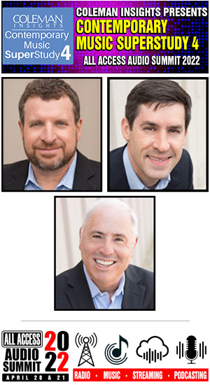 COLEMAN INSIGHTS' fourth CONTEMPORARY MUSIC SUPERSTUDY is back at the virtual ALL ACCESS AUDIO SUMMIT 2022, APRIL 20th-21st. Join us for this important presentation at 11a (PT) on THURSDAY, APRIL 21st. As with the previous CONTEMPORARY MUSIC SUPERSTUDIES there are so many questions to be answered, like: