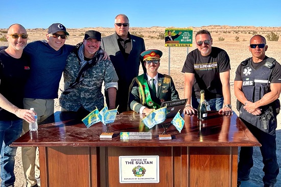 BENZTOWN syndicated SUNDAY NIGHT SLOW JAMS Creator/Host/Producer R DUB! has created his own "micronation," the REPUBLIC OF SLOWJAMASTAN. on an 11-acre plot of land he owns in CALIFORNIA's IMPERIAL COUNTY desert. R DUB! recently hosted a "Meet The Sultan" gathering at SLOWJAMASTAN's INDEPENDENCE SQUARE.
