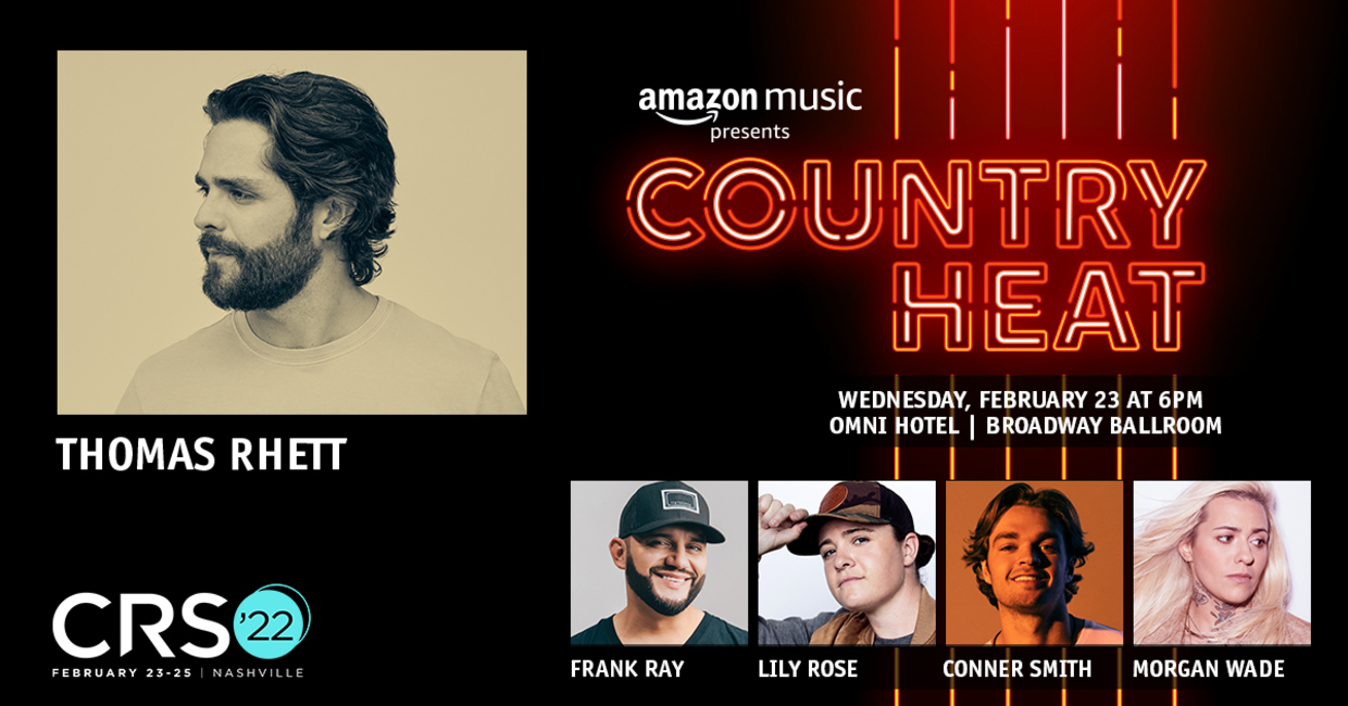 “We’re thrilled to bring 'Country Heat' back to CRS this year,” said AMAZON MUSIC Head of Country Music MICHELLE TIGARD KAMMERER. “We’ve curated a lineup leading with superstar THOMAS RHETT, and featuring four stars on the rise who were also selected as 2022 artists to watch by our programming team. We can’t wait for attendees to watch.”