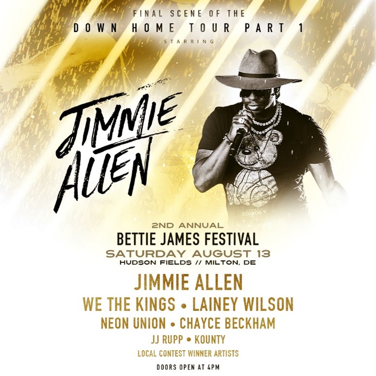 STONEY CREEK RECORDS’ JIMMIE ALLEN has released the lineup for his second annual BETTIE JAMES FEST in his hometown of MILTON, DE on AUGUST 13th at HUDSON FIELDS. WE THE KINGS, LAINEY WILSON, NEON UNION, CHAYCE BECKHAM, JJ RUPP and KOUNTY are scheduled to perform. ALLEN will serve as headliner for the festival, which he established in 2021 in honor of his late grandmother (BETTIE SNEAD) and late father (JAMES ALLEN).