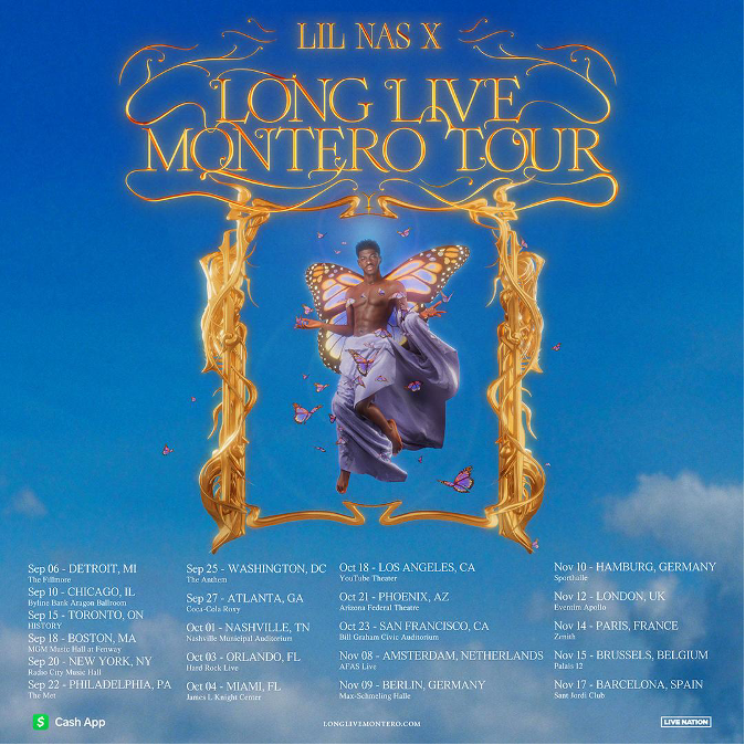 Multi-platinum artist, LIL NAS X has unveiled that he will embark on his first ever world tour - check out the announcement video HERE. The LONG LIVE MONTERO tour will make stops across NORTH AMERICA and EUROPE this fall. The North American leg will kick off at THE FILLMORE in DETROIT on TUESDAY, SEPTEMBER 6th, and will make stops in CHICAGO, NASHVILLE, LOS ANGELES, and more before wrapping up in SAN FRANCISCO, CA at the BILL GRAHAM CIVIC AUDITORIUM on SUNDAY, OCTOBER 23rd. The European leg begins TUESDAY, NOVEMBER 8th in AMSTERDAM and concludes THURSDAY, NOVEMBER 17th in BARCELONA, SPAIN.