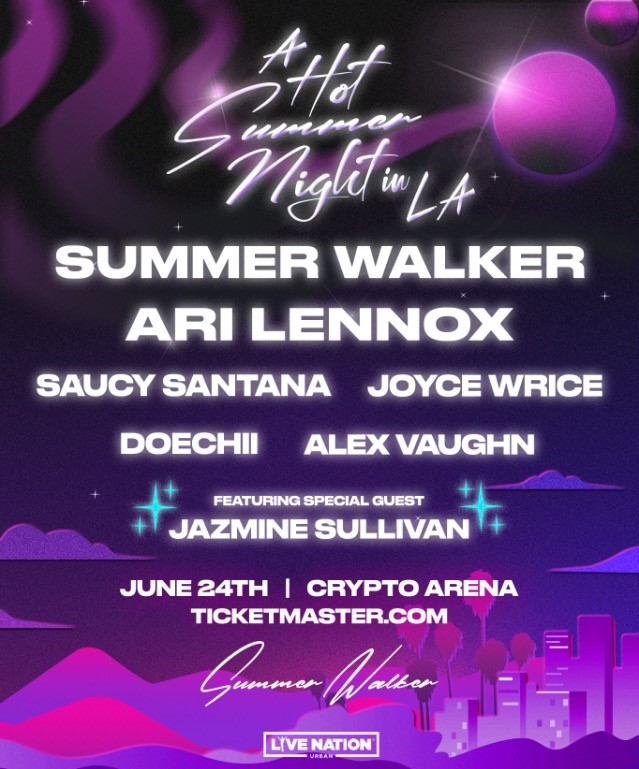 LIVE NATION URBAN and SUMMER WALKER have announced the first-ever A HOT SUMMER NIGHT IN LA at the CRYPTO.COM ARENA on JUNE 24th, 2022. The event will take place during the BET AWARDS weekend, and the multi-platinum ATLANTA R&B artist WALKER will headline the bill. The lineup will also include JAZMINE SULLIVAN, ARI LENNOX, SAUCY SANTANA, JOYCE WRICE, DOECHII and ALEX VAUGHN.