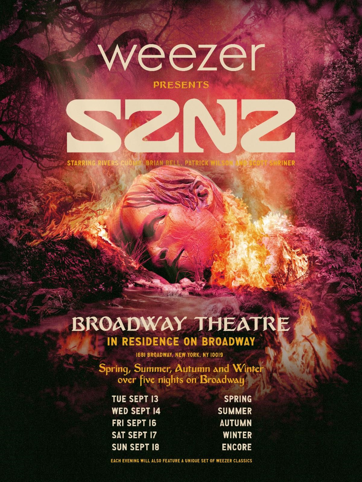 Each night’s show will correspond with a different SZNZ EP with WEEZER digging into its deep catalog to play a unique set of classics, many of which have not been played in years. The fifth night will be a mix of all the songs from SZNZ and WEEZER fan favorites from the previous four nights.