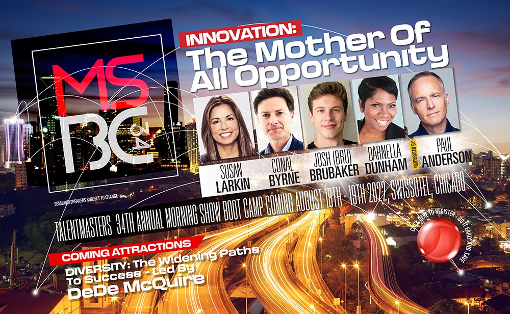 TALENT MASTERS MORNING SHOW BOOTCAMP 2022 is less than two months away and the panels are stacking up with A-listers in the industry (NET NEWS 6/14). CONAL BYRNE, SUSAN LARKIN & DARNELLA DUNHAM are set to be featured on the "Innovation: The Mother Of All Opportunity" panel moderated by Industry Agent Paul Anderson. The panel will take place on FRIDAY, AUGUST 19th at 11a at the SWISSOTEL in Chicago and will cover how the changing media landscape is opening doors to more innovation and creativity.