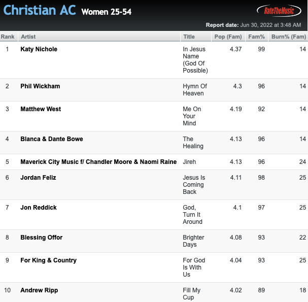 ALL ACCESS Contemporary Christian Format Editor TODD STACH said, "It's so nice to see the diversity of artists who are testing above a 4.0."