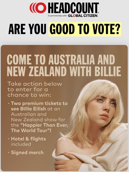 EILISH fans who check their registration status on HeadCount.org/Billie win the chance to receive a VIP experience including travel to her upcoming shows in AUSTRALIA and NEW ZEALAND for her Happier Than Ever World Tour. The elections are fast approaching and with nearly half of all 18-24 year olds not yet registered, the collaboration hopes to excite and incentivize young people to check their registration status or sign up.