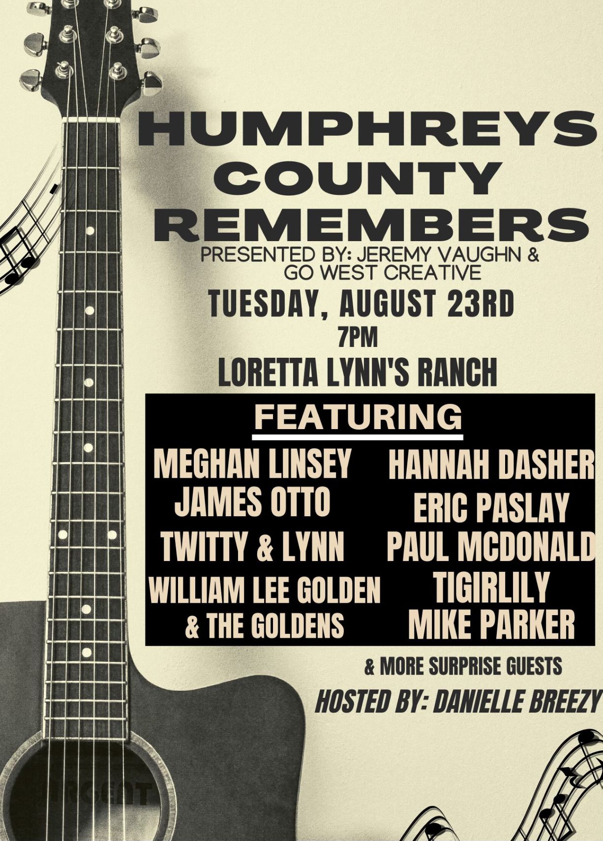 The free show, titled HUMPHREYS COUNTY REMEMBERS, is being organized by HUMPHREYS COUNTY native JEREMY VAUGHN, NASHVILLE-based GO WEST CREATIVE and LYNN’s family, and will feature performances from Country artists MEGHAN LINSEY, JAMES OTTO, HANNAH DASHER, ERIC PASLAY, TIGIRLILY, TWITTY & LYNN, WILLIAM LEE GOLDEN & THE GOLDENS and others. WKRN (NEWS 2)/NASHVILLE television meteorologist DANIELLE BREEZY will host.