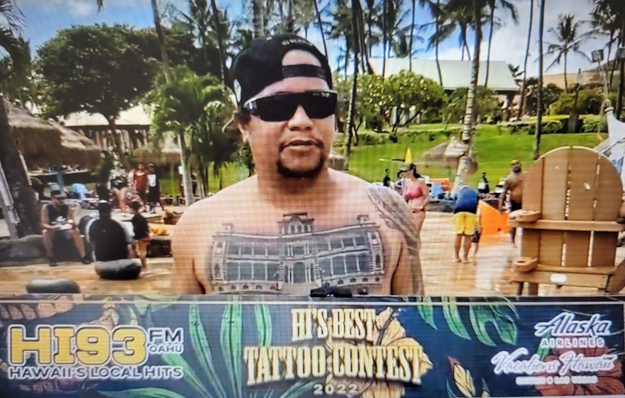 PACIFIC MEDIA GROUP/KQMQ (HI93) HONOLULU held its second-annual “HI’s Best Tattoo” contest, offering the winner $1,000 cash and a trip for two to LAS VEGAS. The criteria for the contest was that the permanent tattoo represent local culture, and the winner, TRAVIS WISE of WAIANAE, won for his tattoo of the IOLANI PALACE.