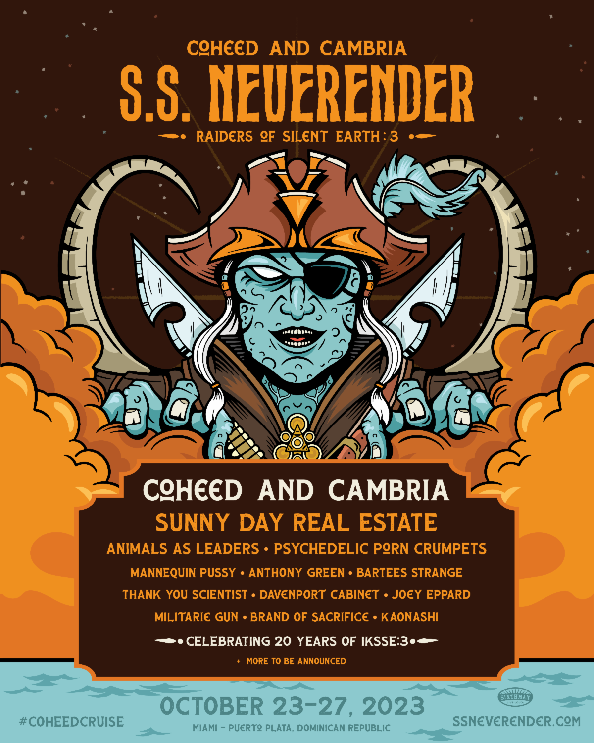 Progressive Rock act COHEED & CAMBRIA will launch their second S.S. NEVERENDER cruise, called the S.S. NEVERENDER – RAIDERS OF SILENT EARTH:3, partnered with SIXTHMAN. The cruise will sail OCTOBER 23–27, 2023 from MIAMI, FL to PUERTO PLATA, DOMINICAN REPUBLIC aboard the NORWEGIAN PEARL.