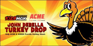 Longtime morning personality JOHN DeBELLA will broadcast live from 6a- 9a (ET) and will accept monetary as well as turkey donations onsite. In addition, members from the WMGK-F on-air staff will simultaneously receive donations during the same time at 12 ACME MARKETS located across PENNSYLVANIA, NEW JERSEY and DELAWARE.
